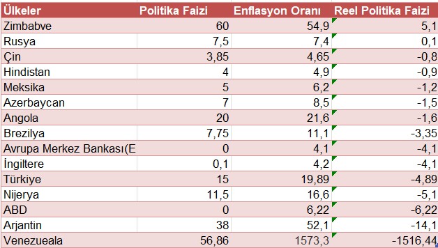 Bazı ülkelerin politika faizi, enflasyonu ve reel politika faizi