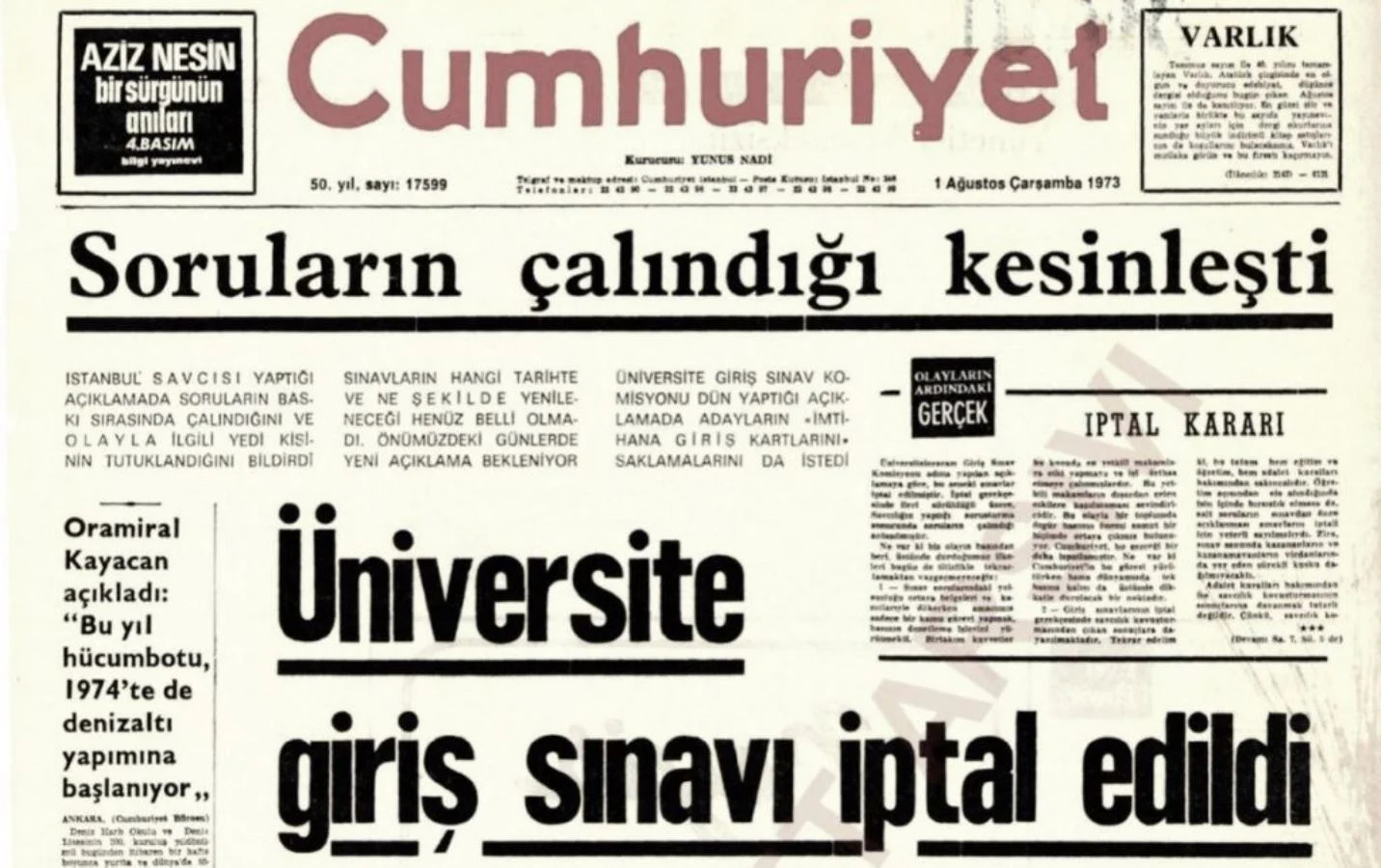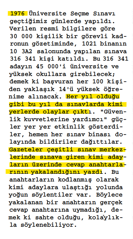 1976 yılında aynı sistemde yapılan Üniversite Seçme Sınavı’nda ise sınava giren adayların üzerinde cevap anahtarı bulundu. Ek olarak, TMMOB’un arşivinde bulunan bir belgede bu yıla kadar sınavlarda güvenlik görevlileri gerektirecek olayların yaşandığı çıkarımı yapılabilmektedir.