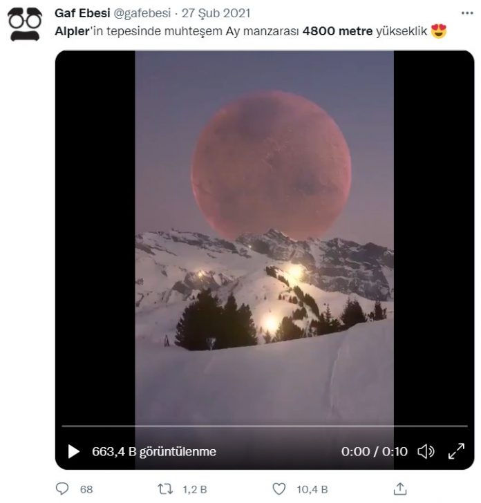 Sosyal medyada oldukça fazla etkileşim alan bir başka görüntü de şimdi inceleyeceğimiz Ay manzarası. Alpler’in tepesinde kayda alındığı iddia edilen bu videoda Ay’ın görüntüsü oldukça olağandışı görülmektedir.