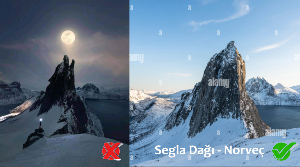 - Fotoğraftaki dağı parçalı olarak aradığımızda, buranın Norveç’te bulunan Segla Dağı olduğunu görüyoruz. Stok görsel sitesi Alamy’de de dağın orijinal görüntüsüne ulaşmak mümkün.