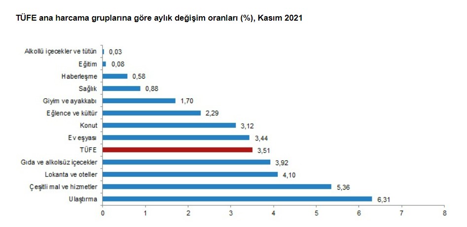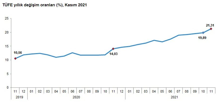TÜİK’e göre Tüketici Fiyat Endeksi yıllık bazda %21,31 artarken aylık bazda %3,51 arttı. Gıda enflasyonu ise %3,92’dir.