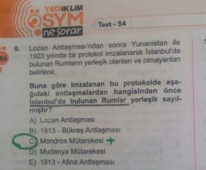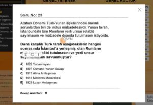 - İddia edilen bir diğer soru ise KPSS’nin Genel Kültür bölümünde yer alan “Türk-Yunan ilişkileri” ile ilgili olan soru. Bu sorunun biçiminin ve aşağıda yer alan şıkların KPSS’deki ilgili soruyla birebir aynı olmasa da benzer olduğunu görüyoruz.
