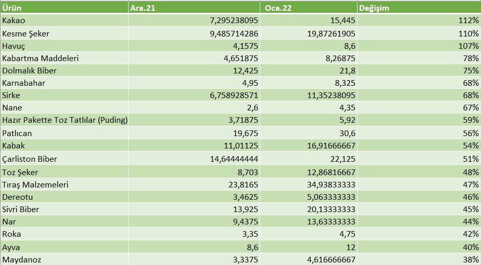 Sepetimizdeki fiyatlarda fiyatı en çok artan 20 ürünü ise aşağıda verdik.