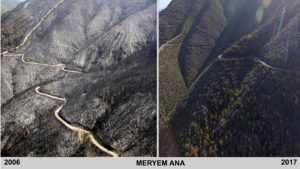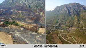 Mersin’in Büyükeceli beldesinde 2008 yılında yanan orman, geçtiğimiz on yılda ağaçlandırmalar sayesinde yeniden kazanılmıştır.