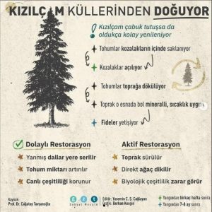 “Yanan ağaçları keserek dalları yere serebilir ve bu sayede erozyonu da önleyebilirsiniz. Çünkü bunu yaparsanız topraktaki erezyonu da engelliyorsunuz. Sonrasında illa destek vermek istiyorsanız, kızılçam tohumu ekebilirsiniz. Böylelikle bu alanı sürmediğiniz için diğer türlerle ağaçların birlikte büyümesini, ekosistemin yenilenmesini sağlayabilirsiniz. Bir miktar tohum desteğiyle bu alanlar yeniden orman haline büründürülebilir.”
