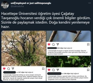 Yangın sonrası için şunu söyleyebilirim: Ağaçlandırma sivil toplum kuruluşlarının, halkın kastettiği anlamıyla yapılınca felaket oluyor. Çünkü bunun için alanın sürülmesi gerekiyor. O alanın sadece ağaçlardan oluşmadığı, çok daha fazla türden oluşan bir ekosistem olduğunu düşünmemiz lazım. Ama sürüp ağaç dikersek biyoçeşitliliği kaybediyoruz. Sert, aşırı müdahaleler oldukça yanlış uygulamalar. Oranın kendini toparlama kapasitesini biliyor olmamız lazım. Kendilerini yenileyebiliyorlar. Böyle özellikleri var.