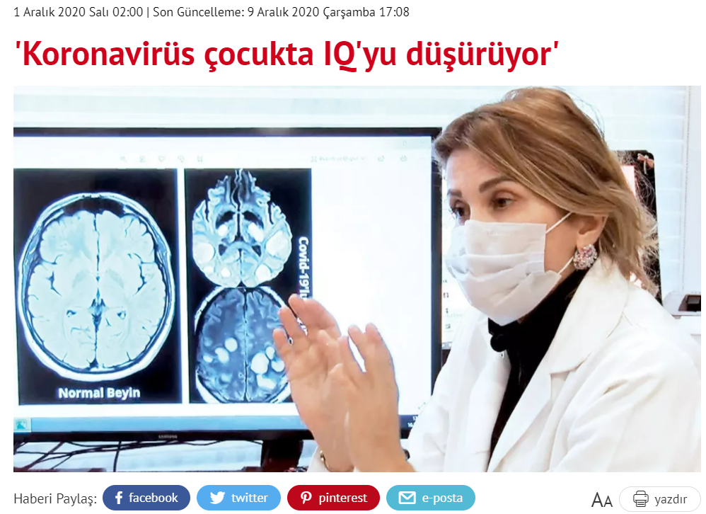Koronavirüs hızla yayılmaya başladığından bu ana yetişkinler birinci derecede tehlikeli grupta yer alırken çocuklar risk gruplarından muaf tutuluyor. İngiliz ve ABD’li üniversitelerin yaptığı ortak bir çalışmada (Imperial College London, King’s College London, Chicago Üniversitesi) COVID-19’un beyinde oluşturabileceği olumsuz sonuçlar, daha doğrusu hasarlar incelenmiş, hastalığı geçiren ve iyileşenlerden bazılarının beyinlerinin neredeyse 10 yıl kadar yaşlanabileceği saptanmış. Aynı araştırmada hastalığı geçirenlerden bazılarının IQ seviyelerinin de düştüğü anlaşılmış. Fakat araştırma kapsamında ele alınan kişiler covid-19 geçirmiş yetişkinlerden oluşuyor. Durum böyleyken IQ seviyesindeki düşüşün çocuklarda da yaşandığı iddialarının doğruluğuna yönelik şüphe duymamak mümkün değil.