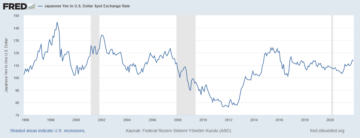 Japon Yeni’nin yıllara göre Amerikan Doları karşısındaki değişim oranı