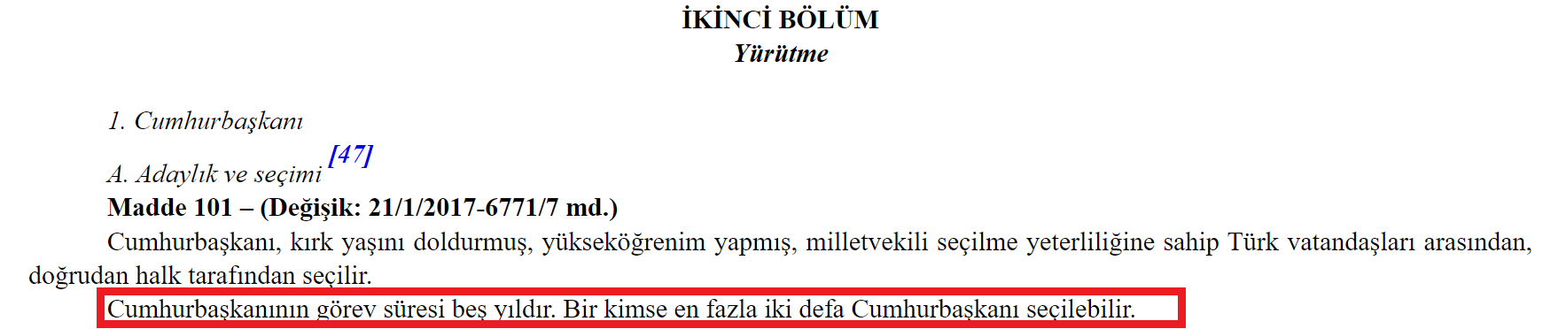 Bu sava göre, Cumhurbaşkanı Recep Tayyip Erdoğan göreve başladığında AY.101/2 hükmü aynı şekilde yürürlükteydi. 2017 yılında yapılan referandumda bu hükme dair herhangi bir değişiklik yapılmadı. Dolayısıyla, Erdoğan’ın 2014-2018 yılları arası 1. dönemi, 2018-2023 yılları da 2.dönemi oluyor. Bu nedenle seçimlerin olağan tarihinde gerçekleşmesi halinde “Cumhurbaşkanının görev süresi beş yıldır. Bir kimse en fazla iki defa Cumhurbaşkanı seçilebilir.” maddesi Erdoğan’ın 3.kez adaylığını engelliyor.