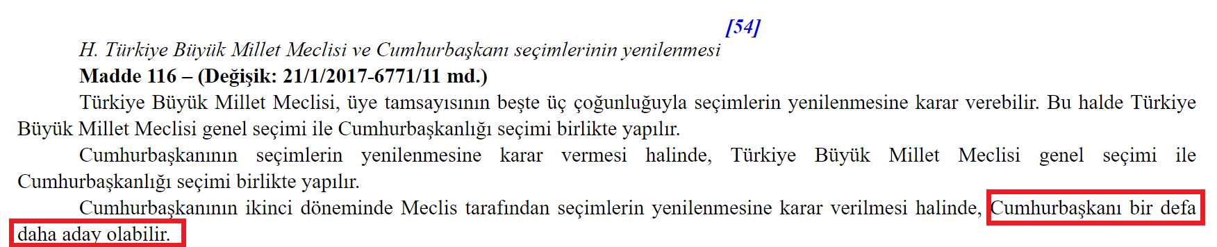 Diğer taraftan, Erdoğan’ın günümüzde ikinci döneminde olduğu tezini kabul etsek dahi Anayasa’ya göre adaylığını mümkün kılan bir yol var. Anayasa 116/3’e göre eğer Meclis seçimlerin yenilenmesine karar verirse Erdoğan’ın 3. kez aday olması mümkün hale geliyor.