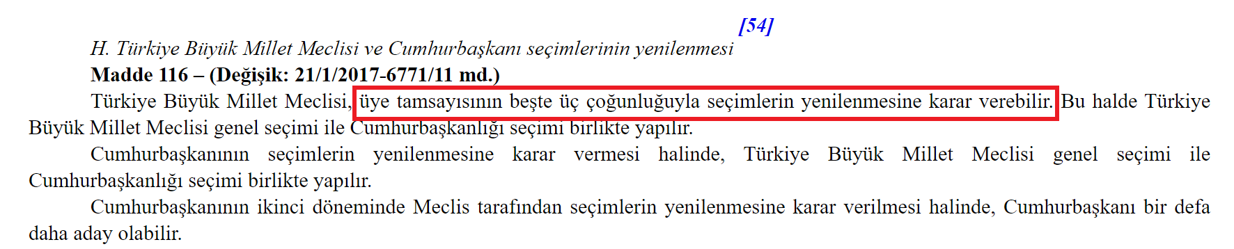 Peki, Meclis bu kararı nasıl verebilir? Meclis üye tam sayısı AY.75’e göre 600 milletvekilidir. Seçimlerin yenilenmesi kararı için milletvekillerinin beşte üçünün (360) oyuna ihtiyaç gerekiyor. Mevcut milletvekili sayılarına baktığımızda Cumhur İttifakı’nın (AKP+MHP+BBP) 335 milletvekiline sahip olduğu görülüyor. Bu nedenle eğer Cumhur İttifakı, seçimlerin yenilenmesi kararını amaçladığı takdirde diğer siyasi parti gruplarından herhangi birisinin desteğine ihtiyaç duyacaktır.
