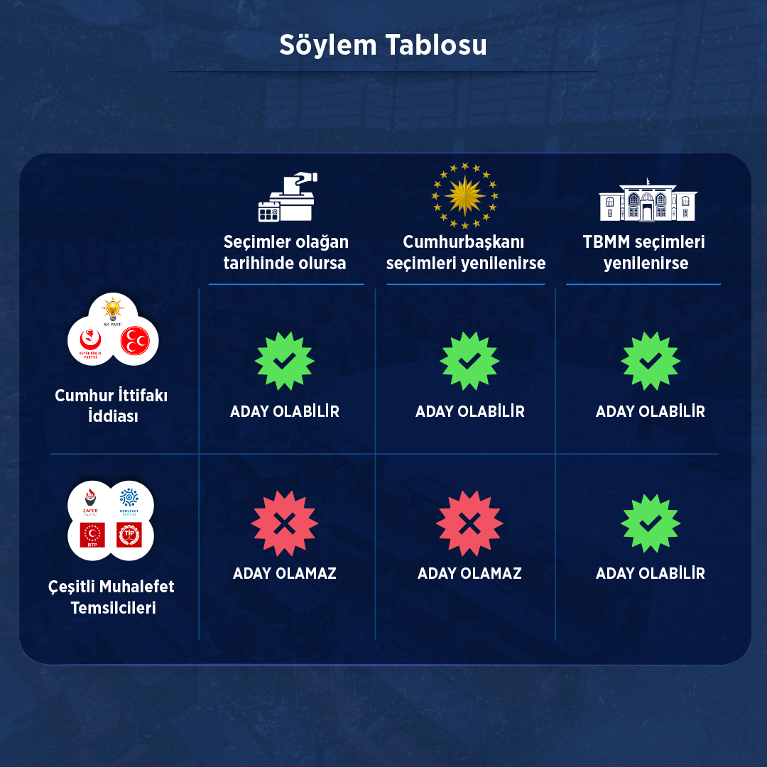 Tüm bilgiler ışığında Erdoğan’ın adaylık durumuna dair görüşleri gösteren tabloyu aşağıda görebilirsiniz.