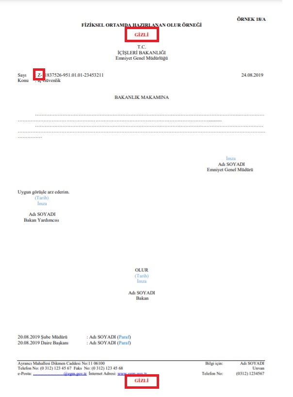 Sahte belgelerin üzerine ‘çok gizli’ veya ‘kişiye özel’ gibi ibareler yerleştirilebiliyor. Bu açıdan resmi belgelerde yer alan bu ibarelerin orijinal olup olmadığına dikkat edilmesi gerekir. Resmî Yazışmalarda Uygulanacak Usul Ve Esaslar Hakkında Yönetmelik maddelerince elektronik olmayan yazışmaların alt ve üst kısımlarında kırmızı damga ile ‘çok gizli’ ibaresi yer alır. Bunun dışında yazının içinde gizli ifadesi bulunmaz. Yönetmeliğin gizli belge örneğine bakıldığında elektronik ortamda yapılan yazışmada ise yine sayfanın üst ve alt kısımlarında kırmızı renkli büyük harfle yazılı belgenin gizlilik derecesini belirten ibare olur. Ayrıca bu tür belgelerin sayı alanında Z harfi olmalıdır.