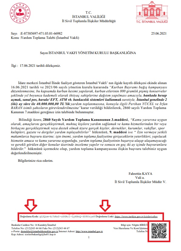 Daha önce yayımladığımız “İstanbul Vakfı’nın bağış toplama talebi 25 Haziran’da reddedilmiş” başlıklı metnimizde bu doğrulama yöntemi kullanılmıştır. İddiaya konu olan belge EBYS Evrak Doğrulama adresi üzerinden teyit edilmiştir.