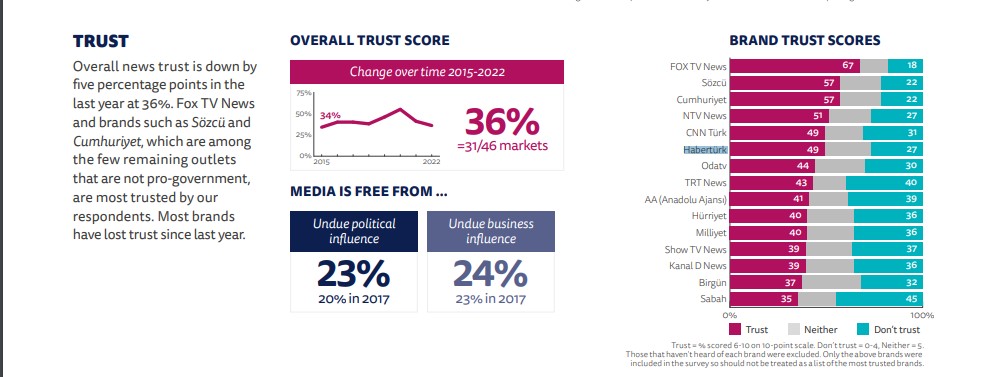 En güvenilir haber kaynaklarına baktığımızda ise sırasıyla Fox, Sözcü, Cumhuriyet, NTV ve CNN Türk yer alıyor. Diğer 45 ülke ile karşılaştırıldığında medyaya güvende Türkiye 31. sırada bulunuyor. Ankete katılanların yalnızca %36’sı medyaya güveniyor ve %23’ü medyanın siyasetin etkisinde olmadığına inanıyor.