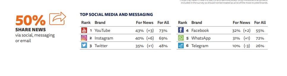 Bunlara ek olarak ankete katılanların %43’ü Youtube, %40’ı Instagram, %35’i Twitter, %32’si Facebook ve %31’i Whatsapp üzerinden haber paylaşıyor.