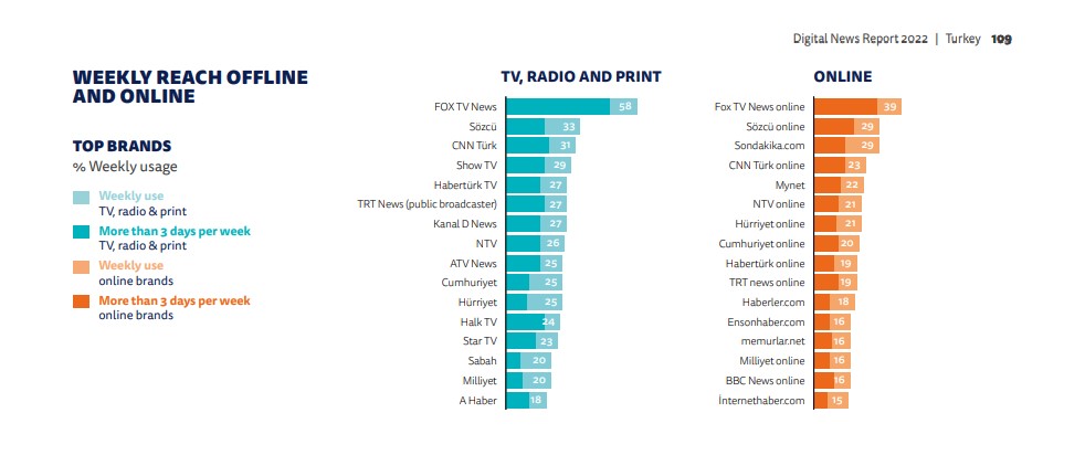 Raporda en çok takip edilen haber kaynakları yer alıyor. Buna göre Türkiye’de hem internet üzerinden hem de geleneksel medyadan en çok takip edilen ilk iki haber kaynağının Fox ve Sözcü olduğu belirtiliyor. CNN Türk ise geleneksel medyada 3. Sırada iken online haber kaynaklarında 4.dür. Online kaynaklarda 3. Sırada sondakika.com yer alıyor.