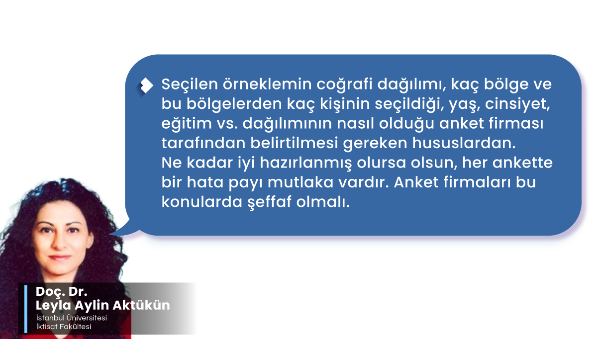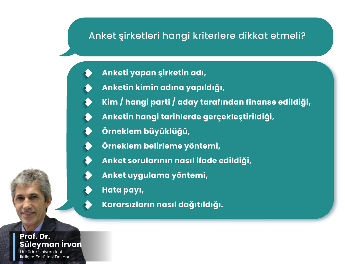 Seçim sürecinde anket şirketlerini çok fazla görüyor, hatta çıkarımlarda bulunabiliyoruz. Bu hassas dönemde şirketlerin metodolojilerinin açık ve şeffaf olması, örneklem büyüklüklerinin yeterli olması ve ankete katılanların demografik dağılımının dengeli olması gibi faktörler göz önüne alınmalı. Ek olarak yapılan anketteki soruların soruluş biçiminin de sonuçlar üzerinde önemli bir etkiye sahip olabileceği göz önünde bulundurulmalıdır. Ayrıca, seçmenlerin bakış açısında etki yaratabileceği için sorular açık ve önyargıdan uzak olmalıdır.