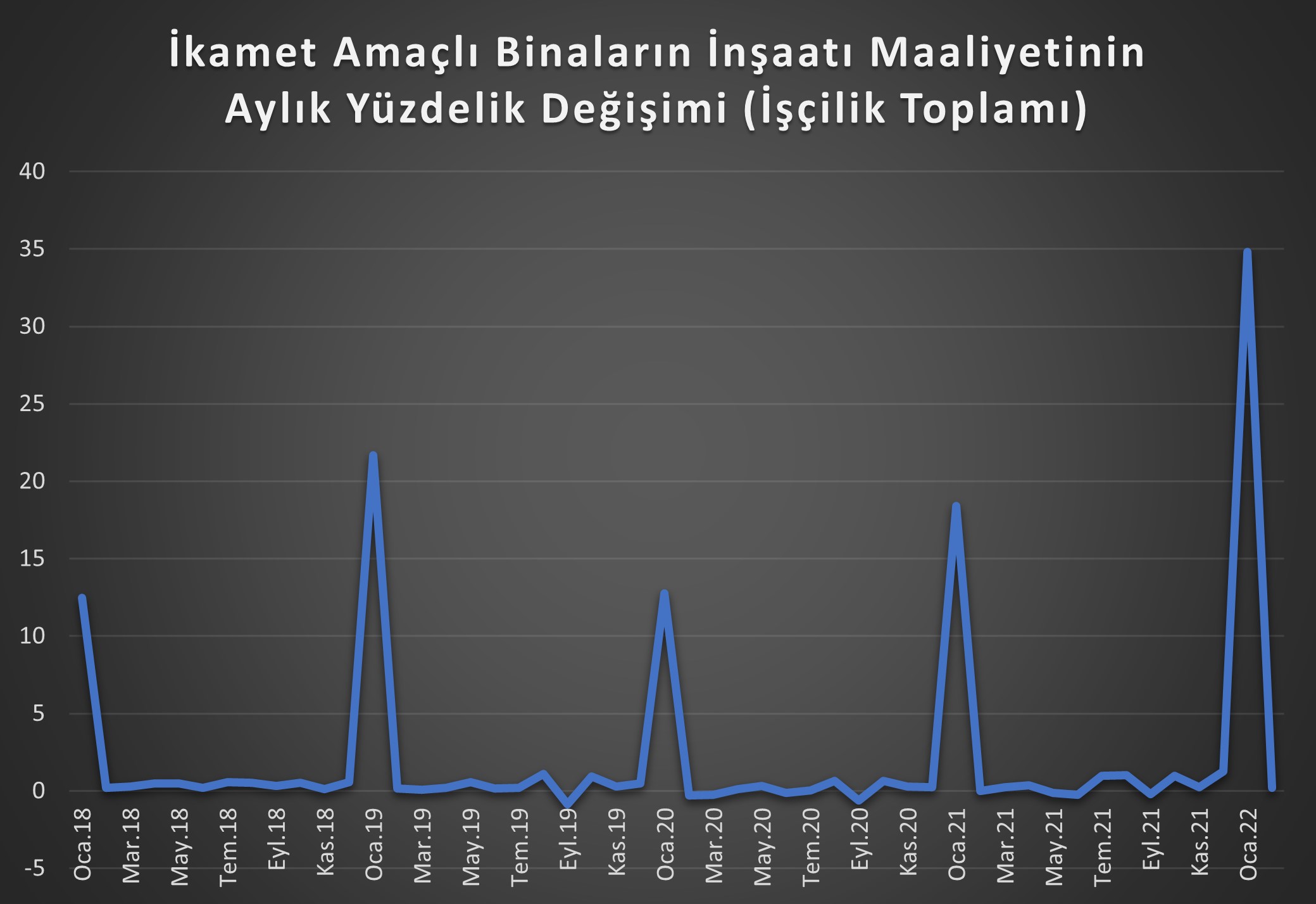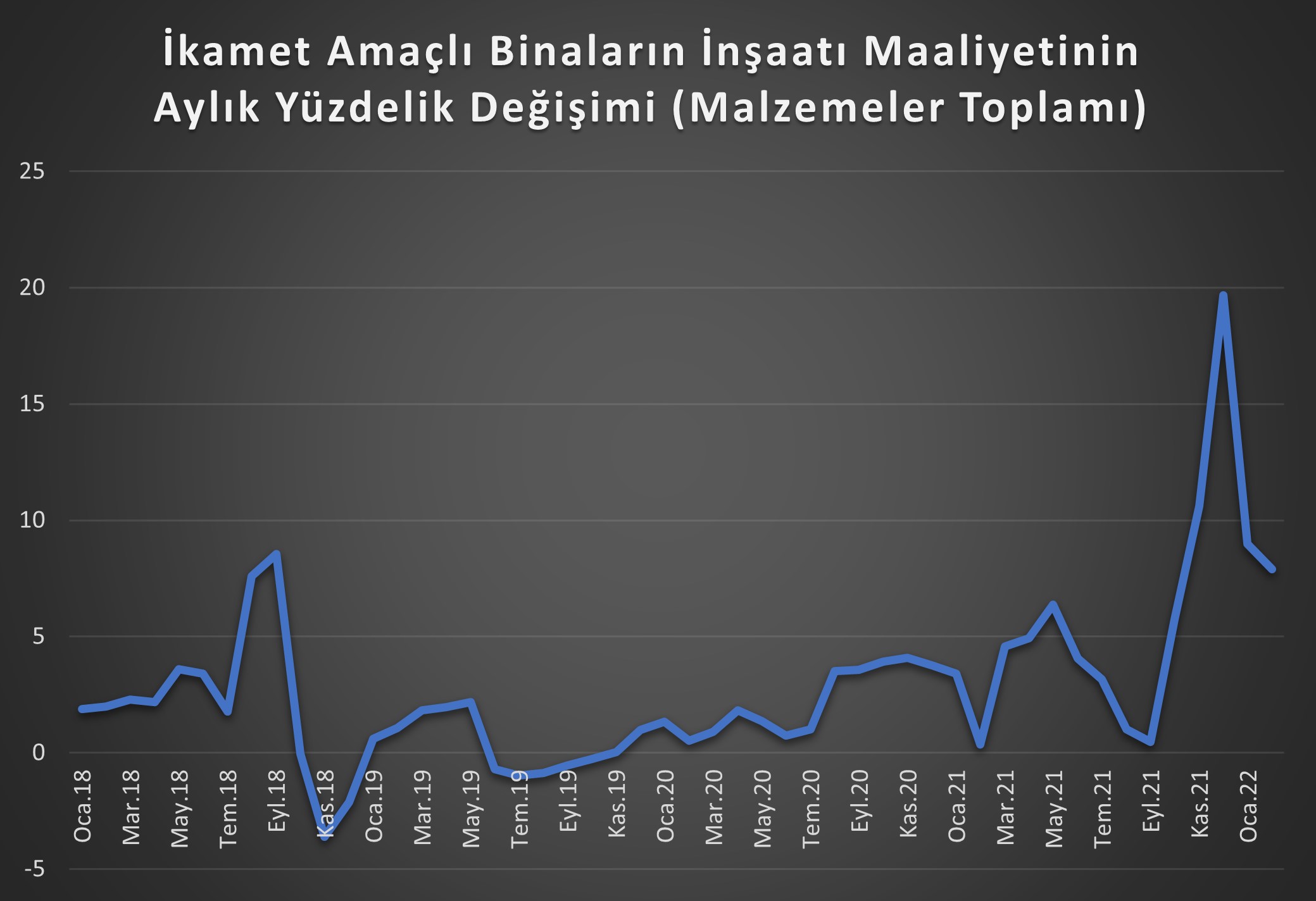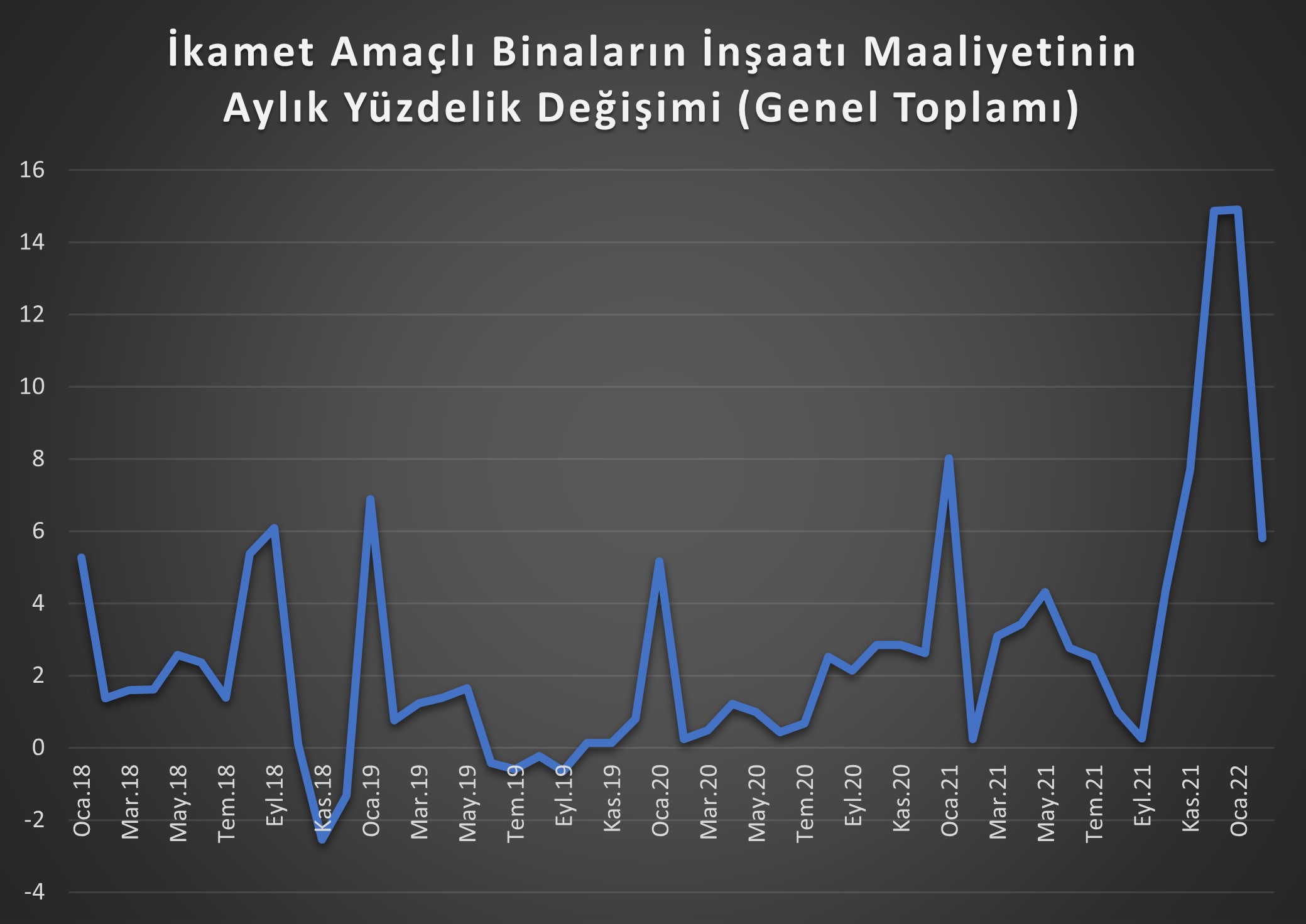 TÜİK her ay inşaat işlerindeki maliyeti endeksi yayınlıyor. İnşaat maliyetindeki değişim de konut fiyatlarını etkileyebileceği söylenebilir. Bu endekse göre ikamet amaçlı binaların inşaat maliyetlerindeki değişimi de aşağıda görebilirsiniz.