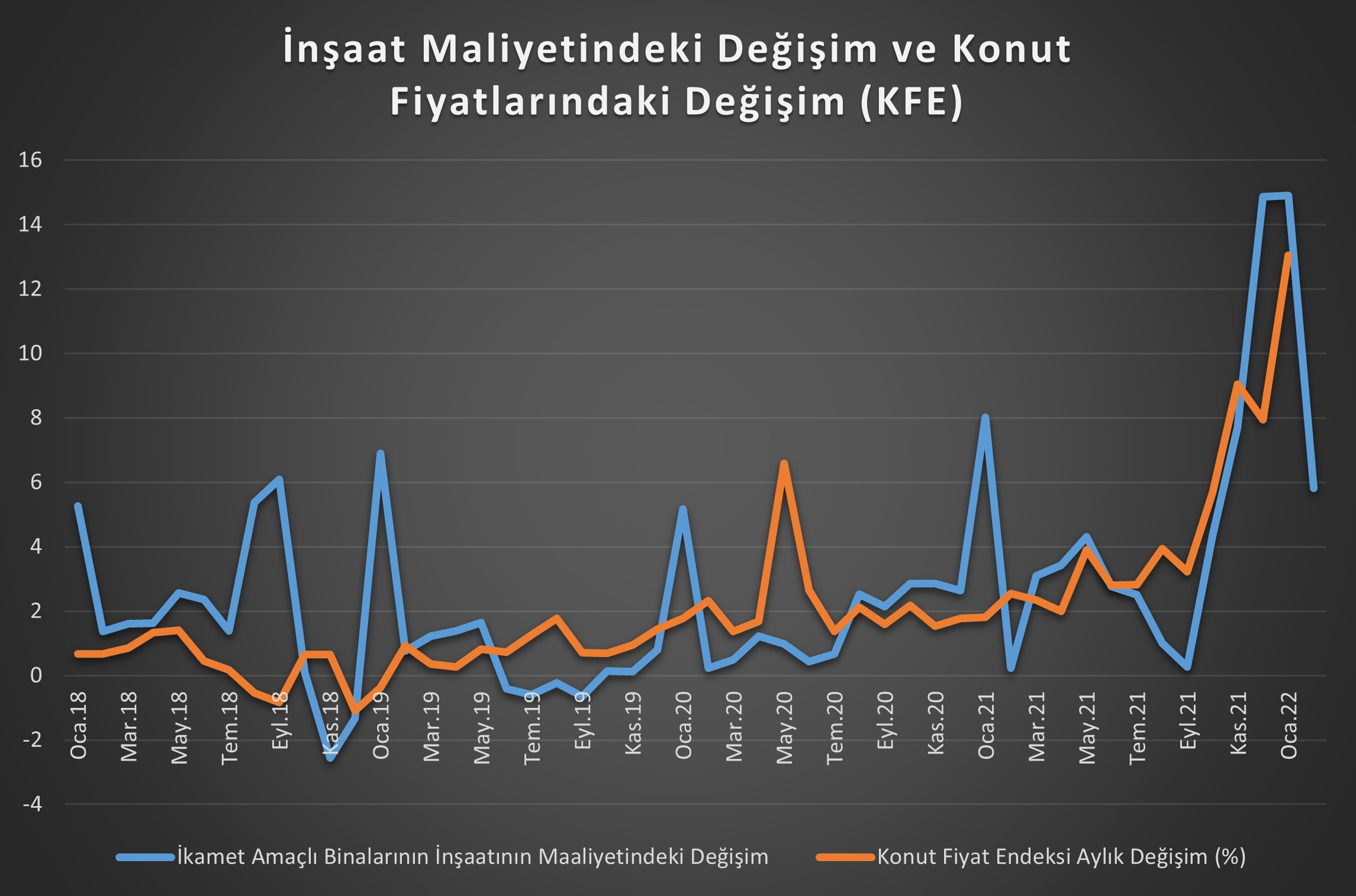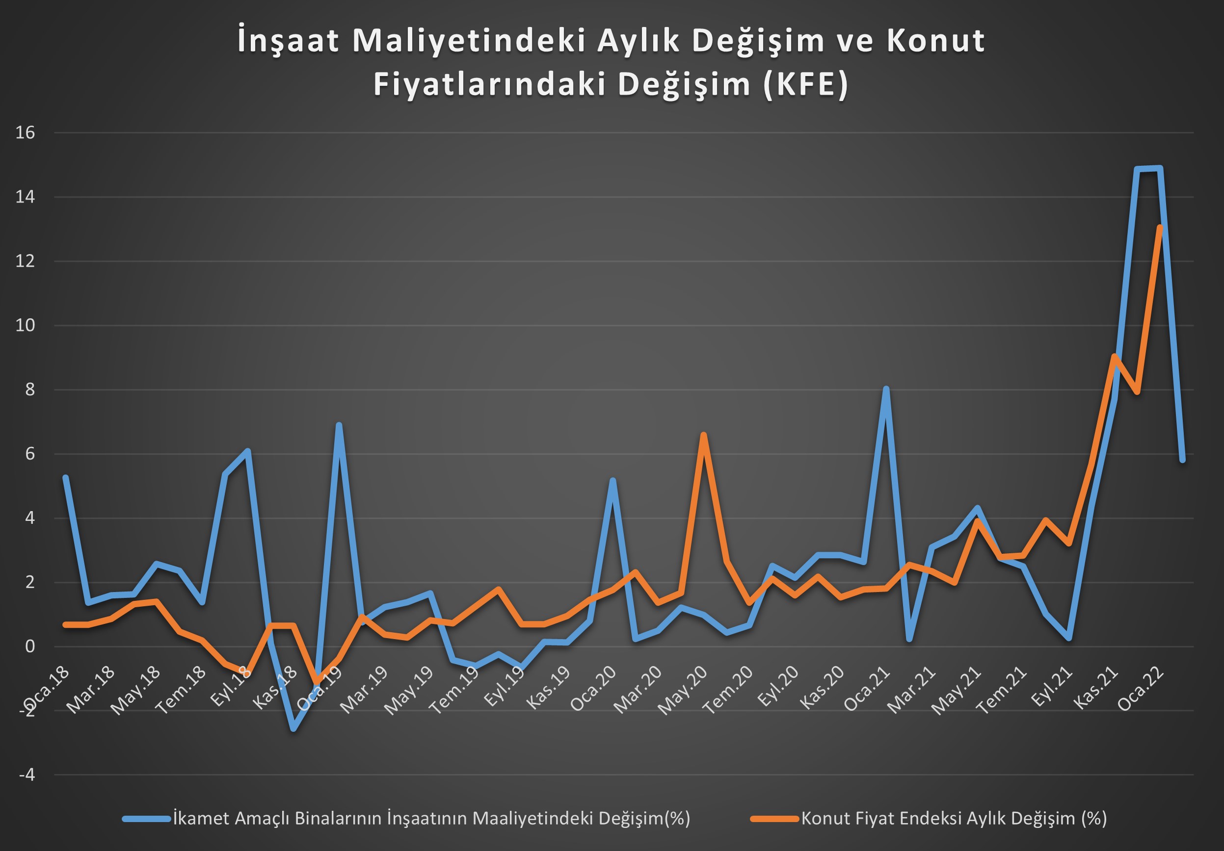 İnşaat maliyetleri 2021 yılının son aylarında bir hayli yükselmiştir. 2021 Aralık’ta ve 2022 Ocak’ta bir önceki aya oranla ikamet amaçlı binaların inşaatlarının maliyetleri yüzde 15 artmıştır. Bu artışın konut satış fiyatlarını da arttırması beklenebilir. İnşaat maliyetlerindeki değişim ve konut satış fiyatlarındaki değişimi aşağıda görebilirsiniz.