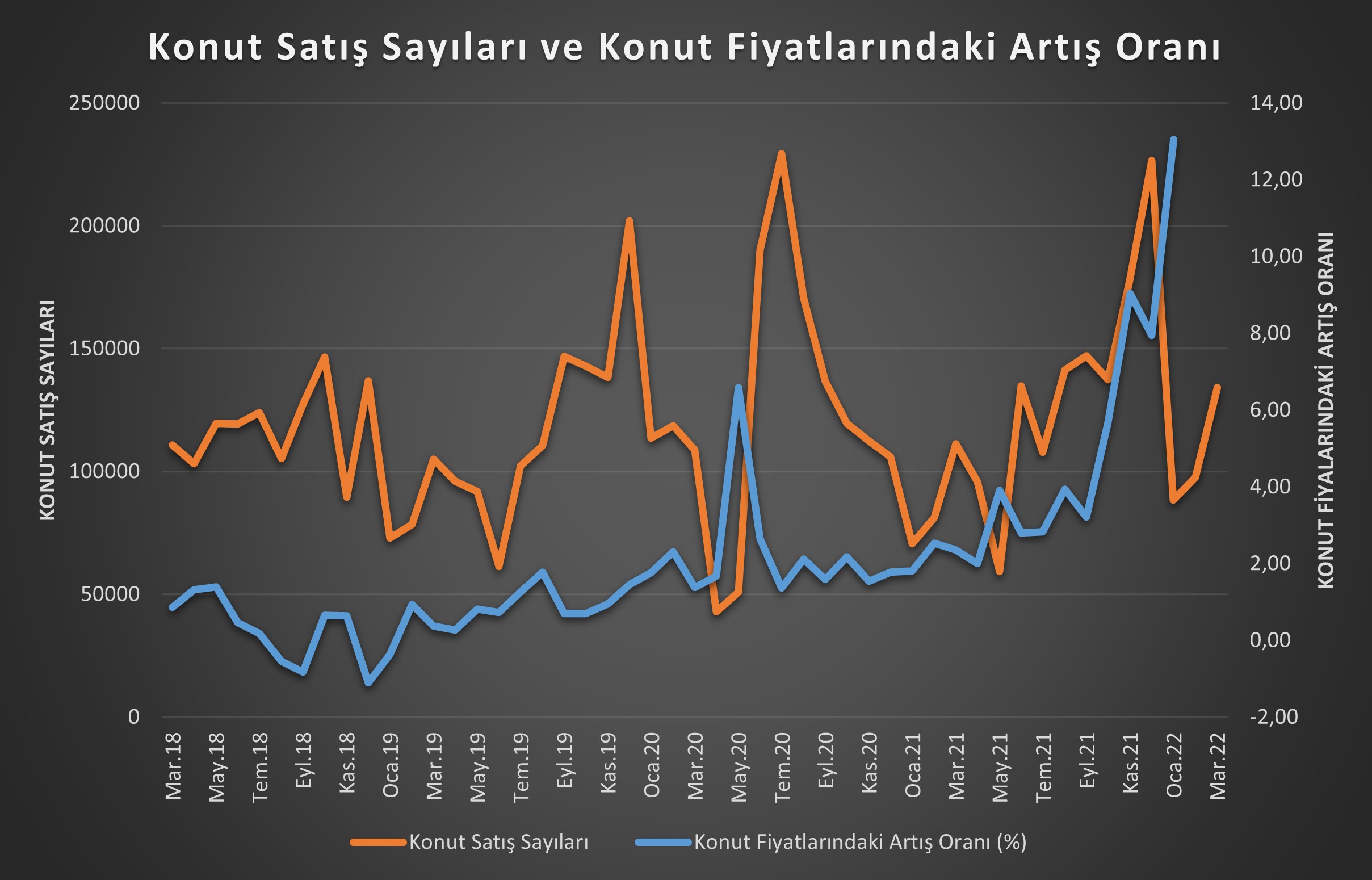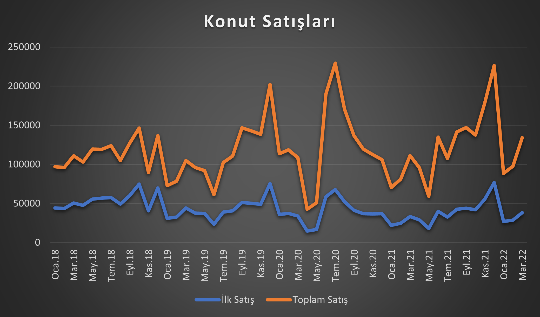 Yukarıdaki grafik incelendiğinde 2019 yılının sonunda, 2020 yılının ortasında ve 2021 yılının sonunda konut satışlarını tepe yaptığını görüyoruz. Bu verilere göre 2021 yılının Aralık ayında 226 bin 503 konut satıldı. 2022 yılının Ocak ayında ise büyük bir düşüş yaşanıyor ve sonraki iki ayda ise satışlarda artış gözüyor.