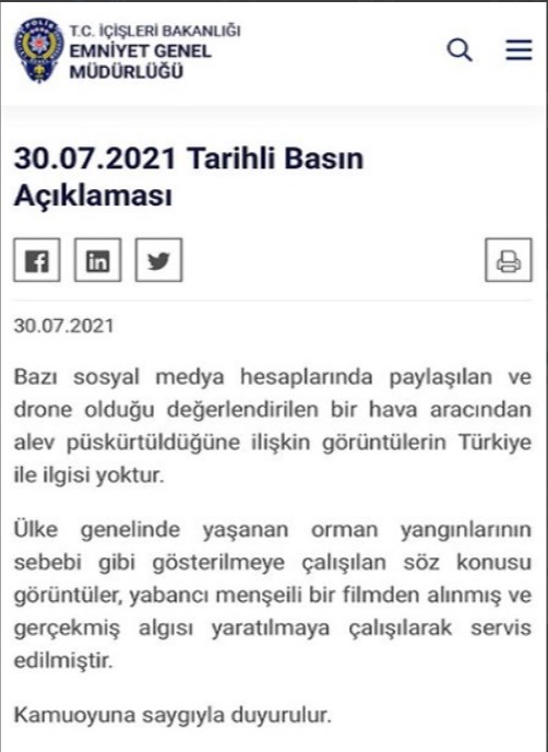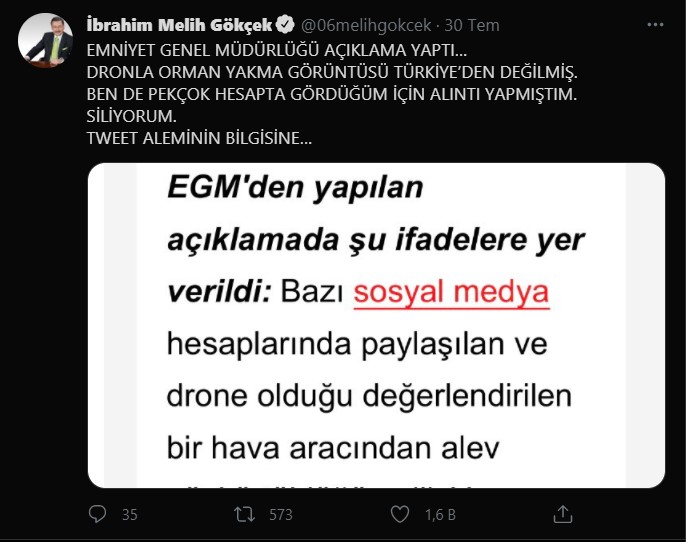 Paylaşımların ardından Emniyet Genel Müdürlüğü, yaptığı basın açıklamasıyla görüntülerin Türkiye ile ilgili olmadığını belirtti. EGM’nin bu açıklamasının ardından Melih Gökçek tweeti sildiğini duyurdu.