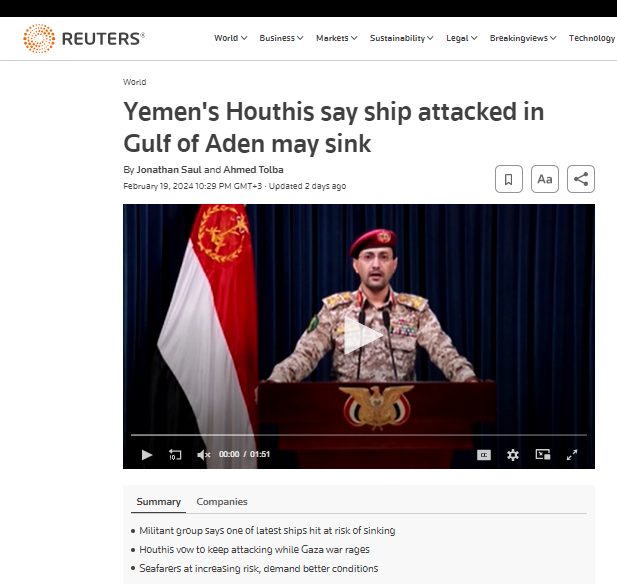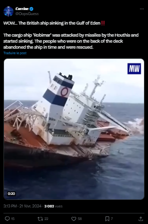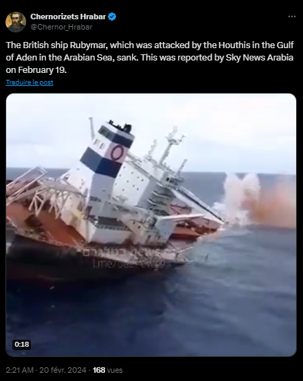 The individuals sharing the video, which we’ll investigate, allege that “The British ship Rubymar, which was attacked by the Houthis in the Gulf of Aden in the Arabian Sea, sank. This was reported by Sky News Arabia on February 19.”