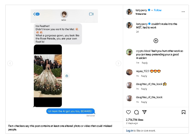 - Katy Perry, the American singer, shared her AI-generated photo on her Instagram account, along with a screenshot of a chat with her mom. In the conversation, her mom remarks, ‘I didn’t know you went to the Met Gala.’ Perry replies with a laughing expression and says, ‘Lol mom AI got you too. BEWARE!.’