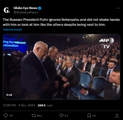 There are also photographs depicting Putin and Netanyahu shaking hands at the press conference preceding the World Holocaust Forum.