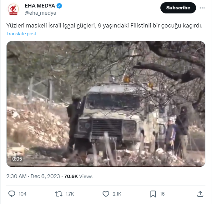 The Israel-Gaza war, which will be two months old in the coming days, is still an important part of the social media agenda. Again, on December 6, 2023, in a video shared by EHA Media, a young child is seen being abducted by masked individuals. Allegedly, the masked group seen in the video consists of Israeli forces, while the kidnapped child was a 9-year-old Palestinian.