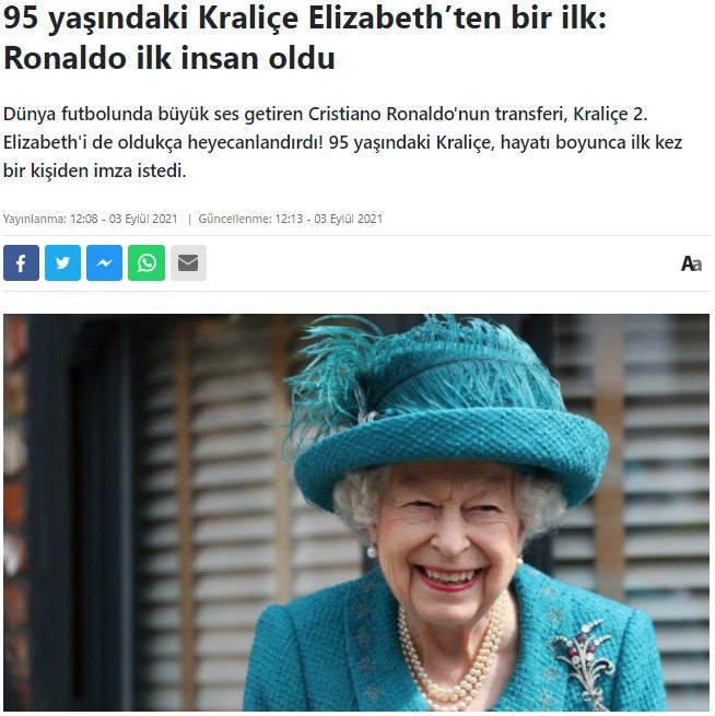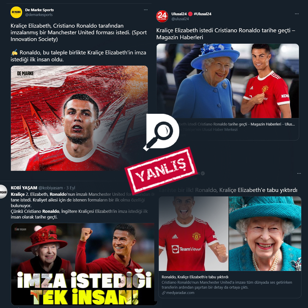 Portekiz’li dünya yıldızı futbolcu Cristiano Ronaldo, kariyerinde önemli bir basamak olan eski kulübü Premier Lig takımı Manchester United ile anlaşmış ve spor medyasında adından çokça söz ettirmişti. Ronaldo’nun bu transfer haberiyle ilgili bazı ilginç söylentiler ortaya atıldı. Söz konusu habere göre Kraliçe 2. Elizabeth, yıldız futbolcudan imzalı formasını istemişti. Yine aynı söylentilerde yıldız futbolcunun, Kraliçe’nin özel olarak imzasını istediği tek kişi olma unvanına sahip olduğu belirtildi. Bu haber, spor medyasında ve birçok basın kuruluşunda paylaşıldı.