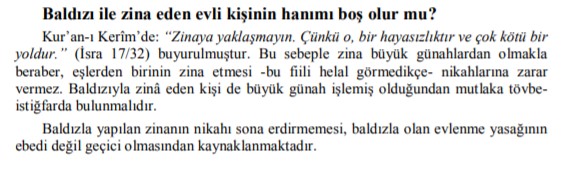 Diyanet’e bağlı Din İşleri Yüksek Kurulu Başkanlığı’nın hazırladığı “Fetvalar” adlı kitabın 2015 basımının 871. Fetvasında baldızla zinaya girmenin nikahı sona erdirmeyeceği ifadesi yer almaktadır.