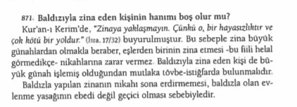 Diyanet İşleri Bakanlığı’na bağlı Din İşleri Yüksek Kurulu Başkanlığı “Fetvalar” isminde bir kitap yayınlamıştır. Başkanlık zaman zaman bu kitabın yeni baskısı çıkarmaktadır. Diyanet İşleri Başkanlığı’nın sitesinde kitabın 2018 versiyonu bulunmaktadır. Bu kitabın 871. Fetvası zina ile alakalı değildir.