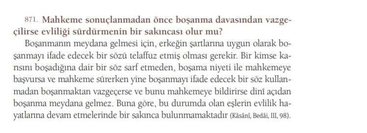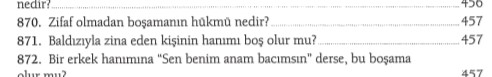 Kitabın 2015 versiyonunun elektronik sürümünü ne Diyanet’in sitesinde ne de kütüphanelerin sitelerinde bulabildik. Yalnızca İslam Araştırmaları Merkezi’nin kütüphanesinde kitabın içindekiler sayfalarını içeren PDF’ni bulabildik. Burada 871. Fetvada “Baldızı ile zina eden kişinin hanımı boş olur mu?” sorusu sorulmaktadır.