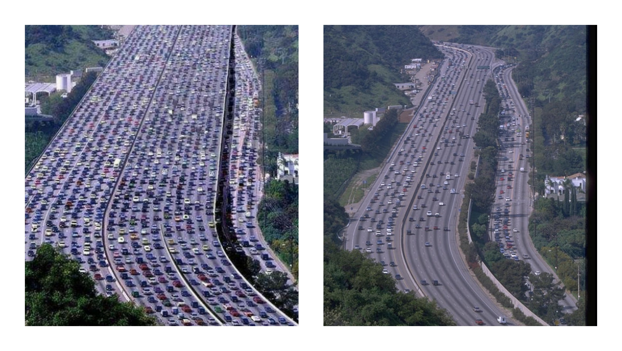Fotoğraf, Güney Kaliforniya’daki Interstate 405 otoyoluna ait. Trafikte sıkışmış arabaların görüldüğü fotoğraf, daha fazla şerit varmış izlenimi vermek için dijital olarak değiştirilmiş.