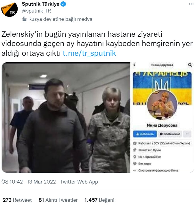 Paylaşımın ardından birçok sosyal medya kullanıcısı ve haber kurumu videoda görülen kişinin yaralılara yardım ederken vefat eden Inna Derusova olduğu öne sürdü. İddia sahipleri, Başkan Zelenski’nin Ukrayna’da yaşanan savunmalarda orada bulunmadığını belirterek, videonun sahte olduğunu ve Inna Derusova’nın ölümünden önce çekildiğini iddia etti.