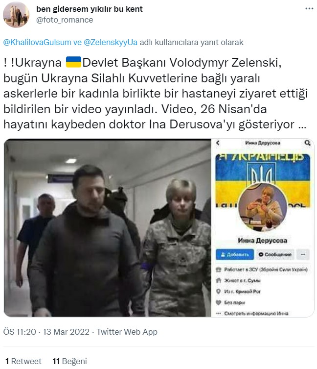Zelenski’nin yanında görülen kişinin saldırılar sonucu hayatını kaybeden Inna Derusova’yı gösterdiği iddiası