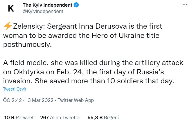 13 Mart tarihinde paylaşılan gönderide, Zelenski: “Çavuş Inna Derusova, ölümünden sonra Ukrayna Kahramanı unvanını alan ilk kadın. Bir saha doktoru, Rusya’nın işgalinin ilk günü olan 24 Şubat’ta Okhtyrka’ya yapılan topçu saldırısı sırasında öldürüldü. O gün 10’dan fazla askeri kurtardı” ifadelerini kullanmış;